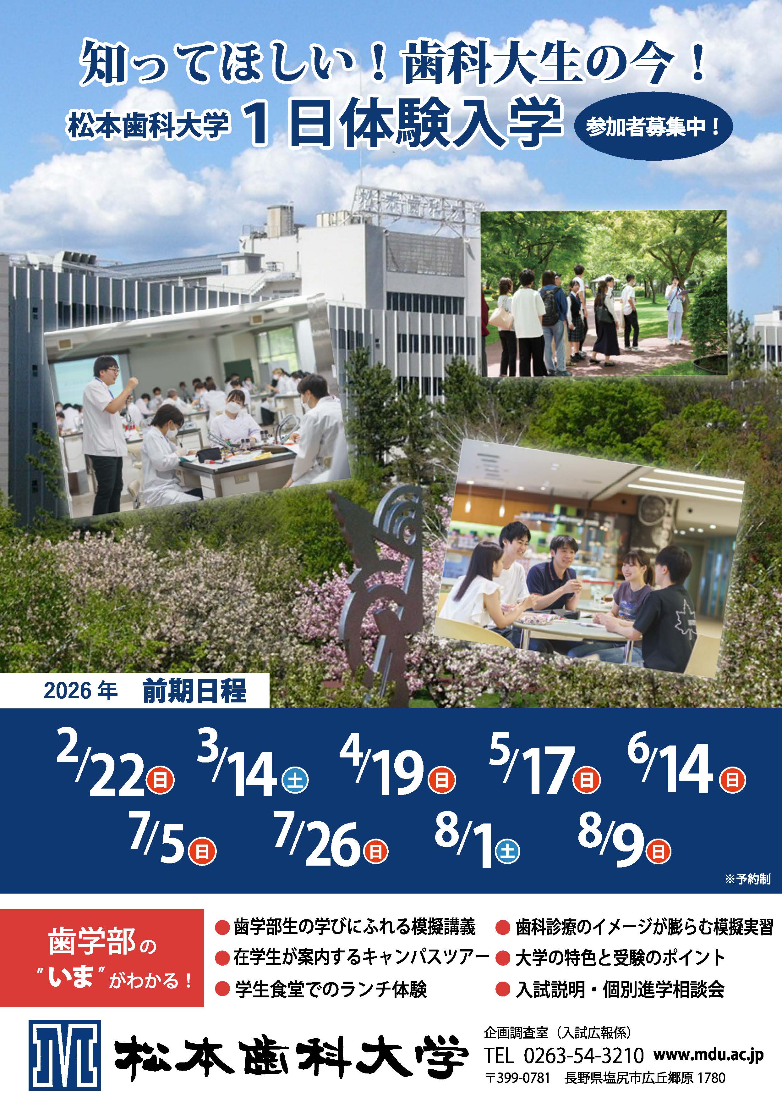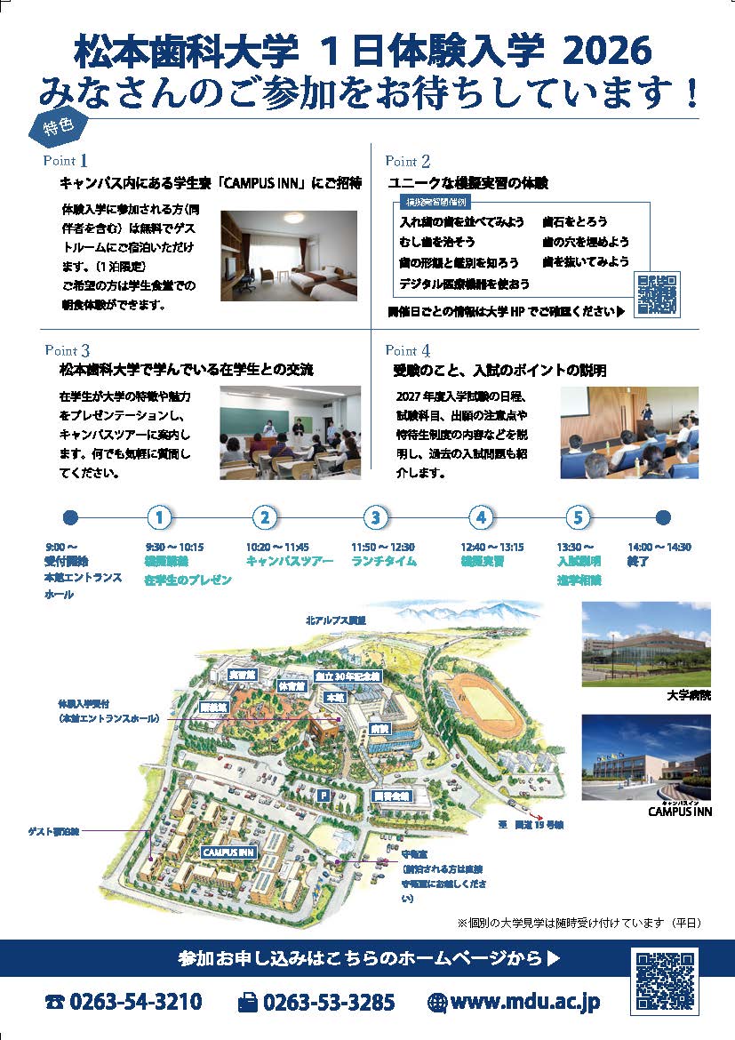 自宅や好きな場所で本学の雰囲気を体験できるWEBオープンキャンパスも実施しています。歯学部長が本学の魅力や特色をお伝えするメッセージ動画や360°パノラマ写真で本学を体感してください。Google MeetやZoomアプリを使用したオンライン個別相談会もあわせて実施中です。本学の教育方針やカリキュラム、授業内容、入試についてなどあらゆる質問やお悩みに本学教員と入試広報室スタッフがお答えします。