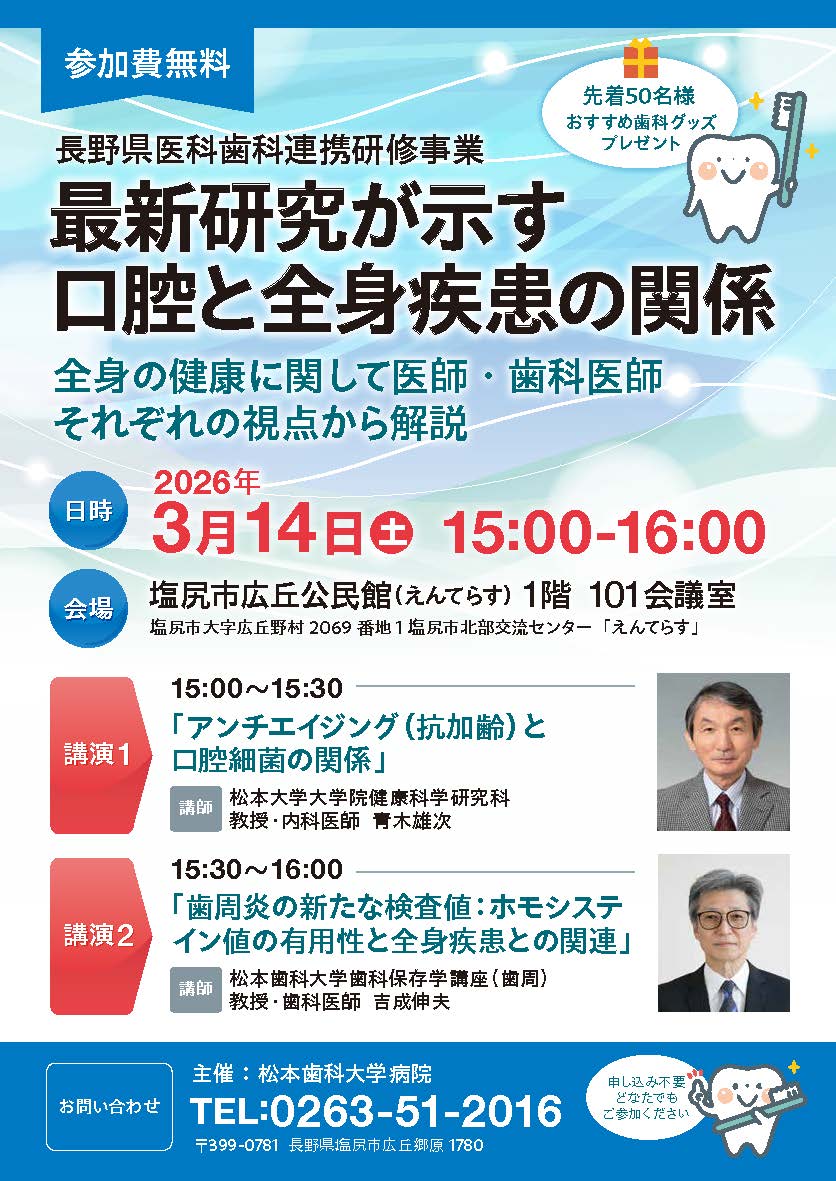 3月14日(土)15:00~16:00、塩尻市広丘公民館(えんてらす)において講演会「最新研究が示す口腔と全身疾患の関係」を開催します。