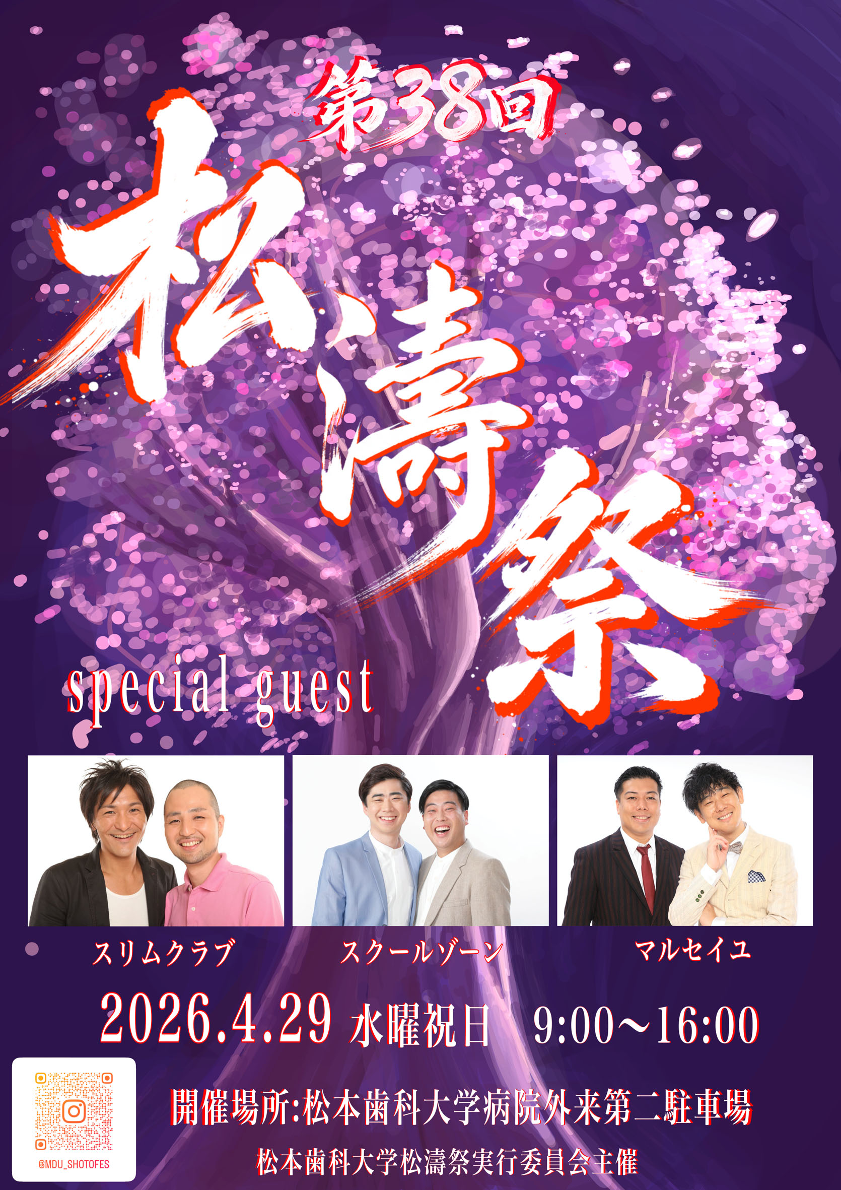 松本歯科大学学園祭、第38回松濤祭が4月29日(水・祝)、病院外来者駐車場で開催される。学生による飲食と体験型の模擬店や、軽音楽部のライブなどがある。今回の豪華特別ゲストは、お笑いコンビの「スリムクラブ」「スクールゾーン」「マルセイユ」の3組で、公演は午後1時から、会場内の特設ステージで行われる。観覧無料。